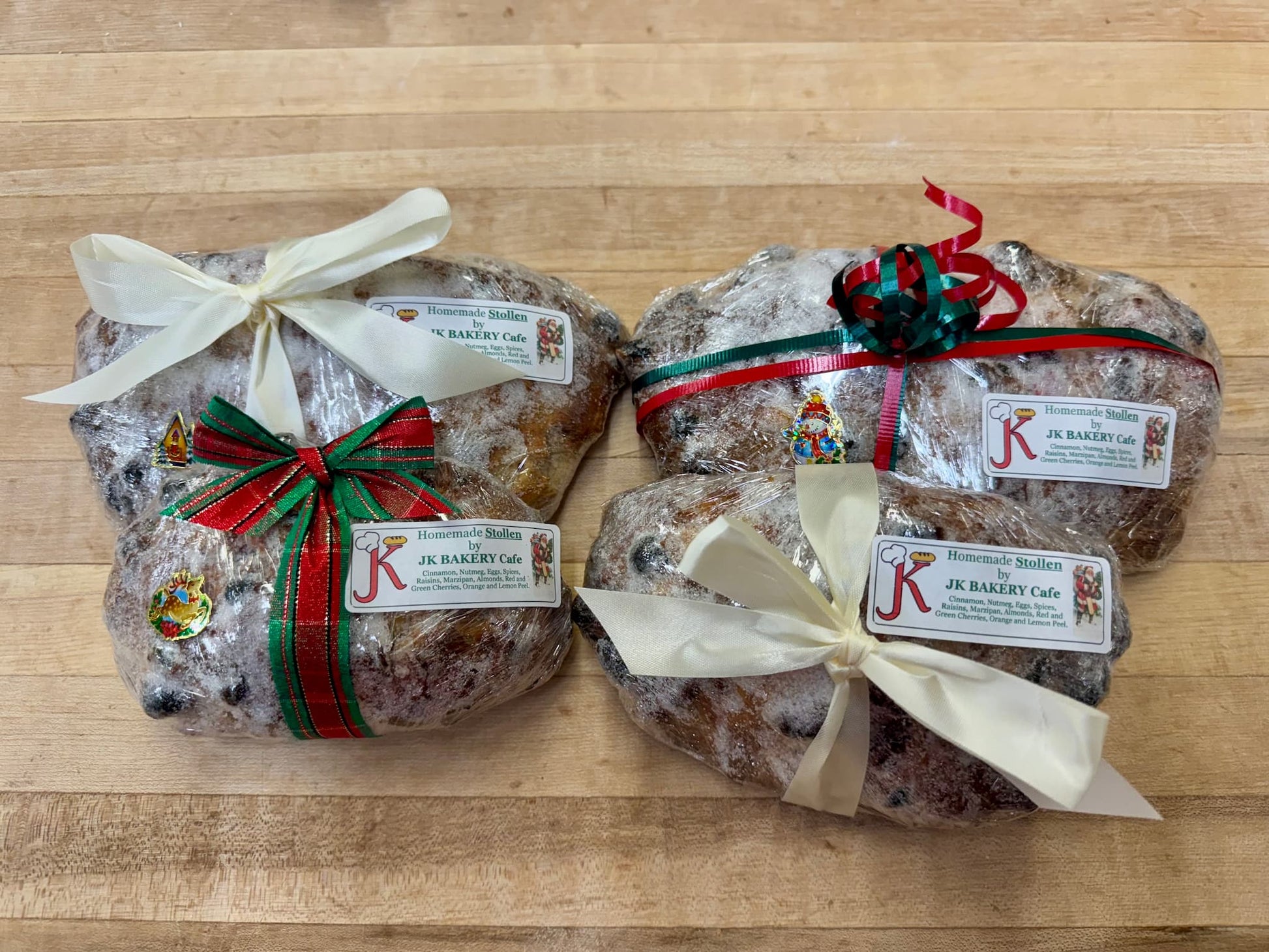 Stollen is a traditional German fruit bread eaten during the Christmas season. It consists of nuts, spices, and dried or candied fruit, coated with powdered sugar.